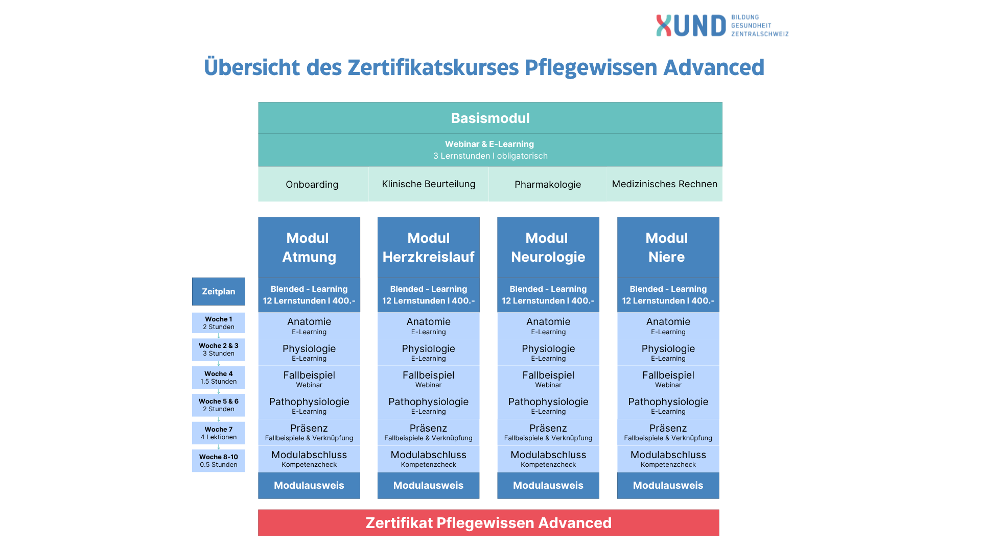 Das obligatorische Basismodul eröffnet den modularen Zertifikatskurs «Pflegewissen Advanced» und macht mit dem digitalen Lernraum vertraut. In einem kurzen Webinar lernen die Teilnehmenden die wichtigsten E-Tools kennen: Moodle, Padlet, E-Learning-Module sowie den Brain AI Tutor. Sie erhalten einen klaren Überblick, testen erste Funktionen und klären offene Fragen. Anschliessend bearbeiten sie selbstständig die E-Learnings zu klinischer Patientenbeurteilung, Pharmakologie und medizinischem Rechnen. Das Basismodul legt damit die Grundlage, um die weiteren Kursmodule sicher und effizient zu nutzen.